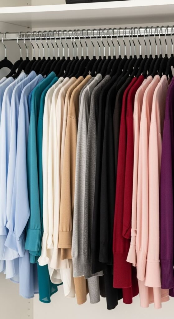 - Hang shorter items (tops, blazers) on the top rod and matching bottoms below.