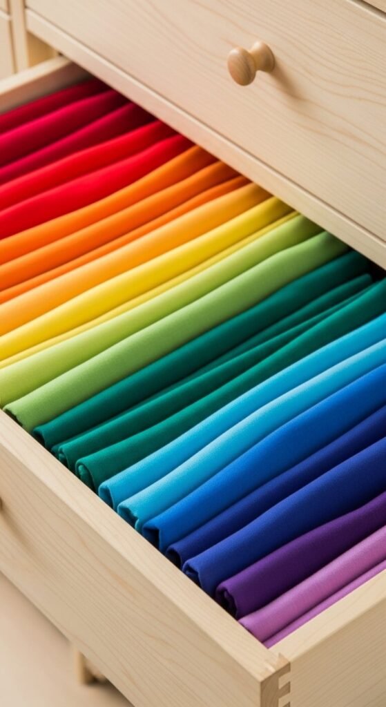 How you fold matters as much as where you store things. The vertical fold method (made famous by tidying experts everywhere) is a revelation for drawers and bins.
