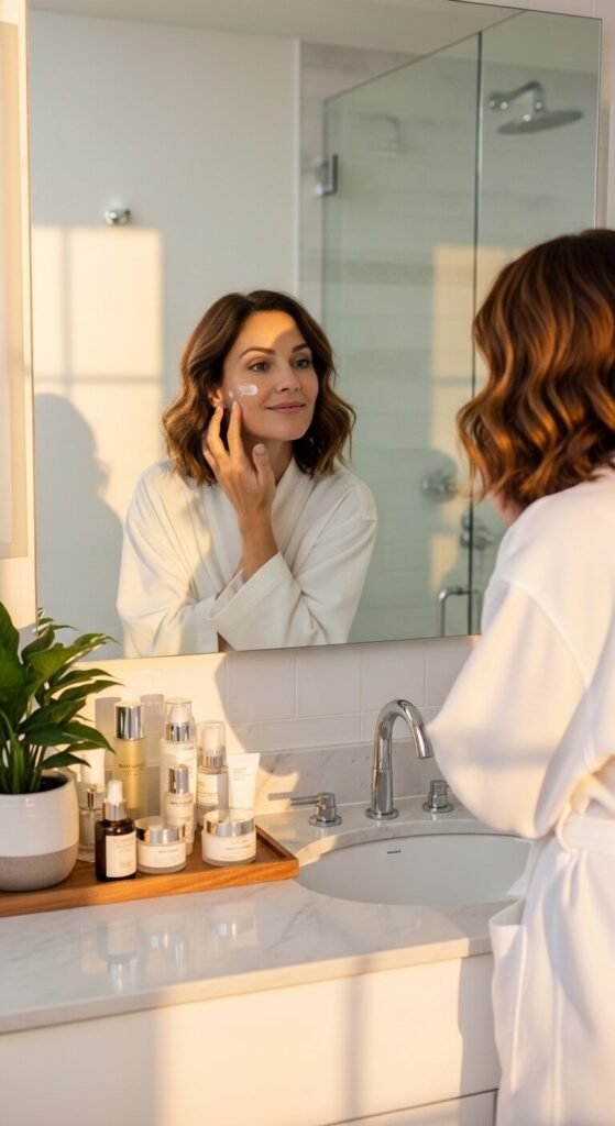 - Occasionally: Sheet masks, specialty treatments, backup products — these can live in a lower cabinet or a basket under the sink.