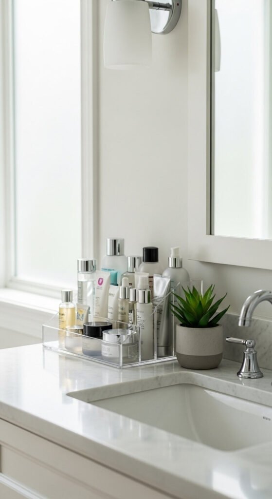 - Clear acrylic organizers for skincare so you can see everything at a glance