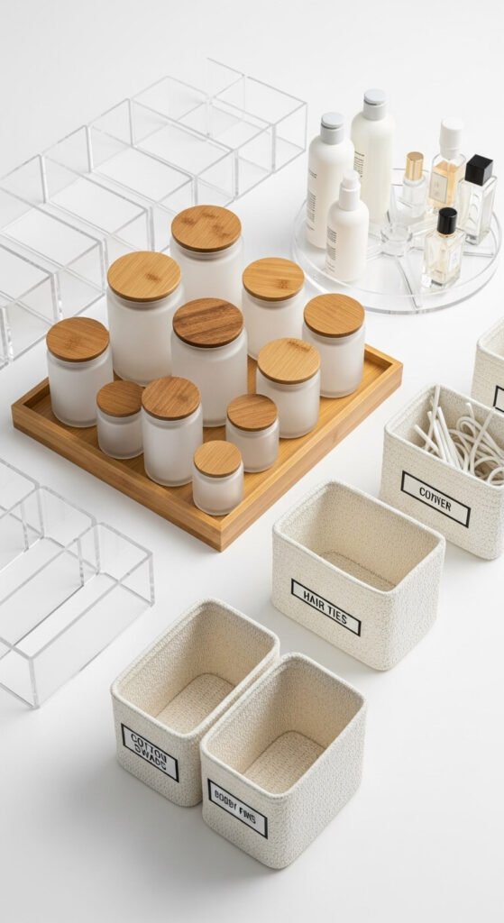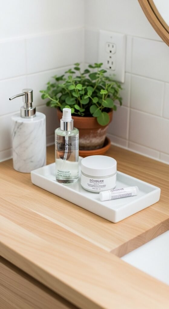 The secret to a vanity that stays organized is containment. Loose products slide around, get forgotten, or create visual chaos that makes your bathroom feel messy even when it’s technically clean.