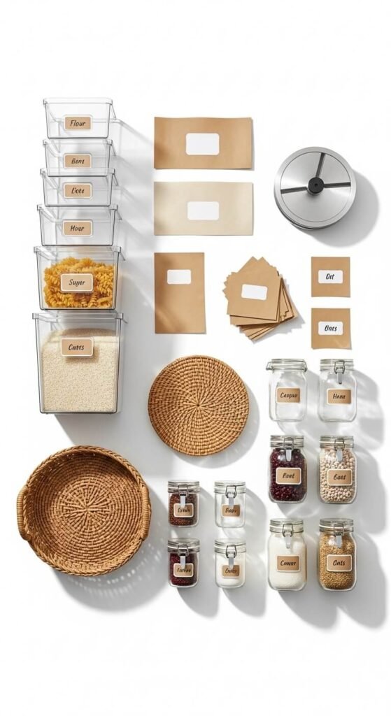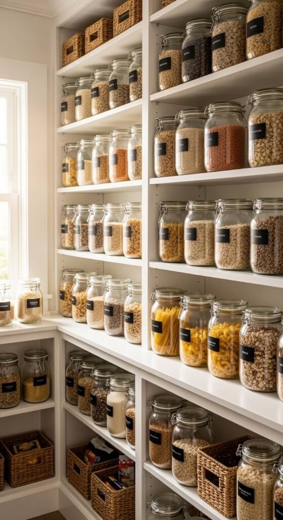 Stick to a cohesive color palette: all-white, all-natural (wood + wicker), or clear-only. Mixing too many styles is what makes pantries look cluttered even when they’re organized.