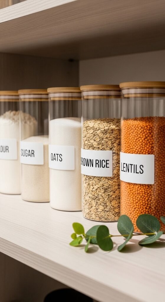 Decanting means transferring pantry staples — flour, sugar, pasta, rice, oats — from their original bags into uniform containers. It’s not just about looks; it keeps food fresher and lets you see when you’re running low.