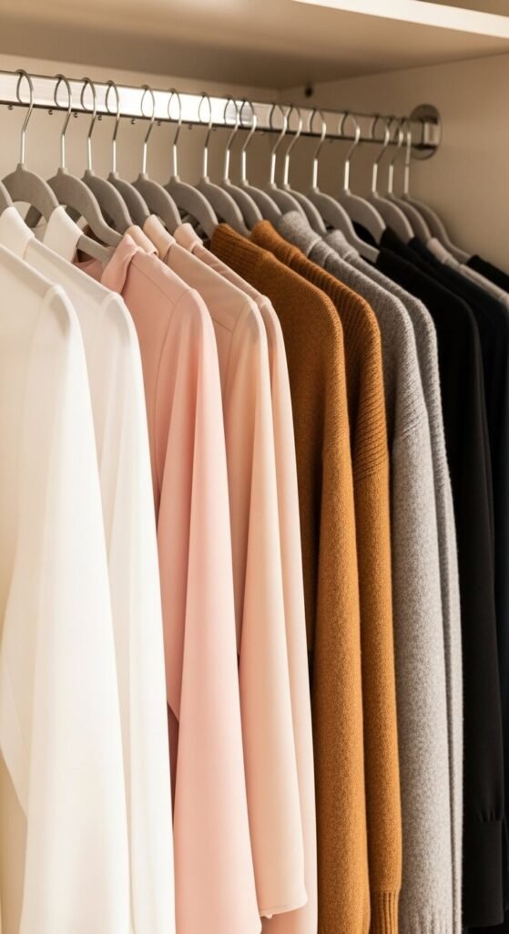This is the single most transformative trick used in luxury retail — and it works just as powerfully at home. Arrange your clothing within each category by color, moving light to dark.