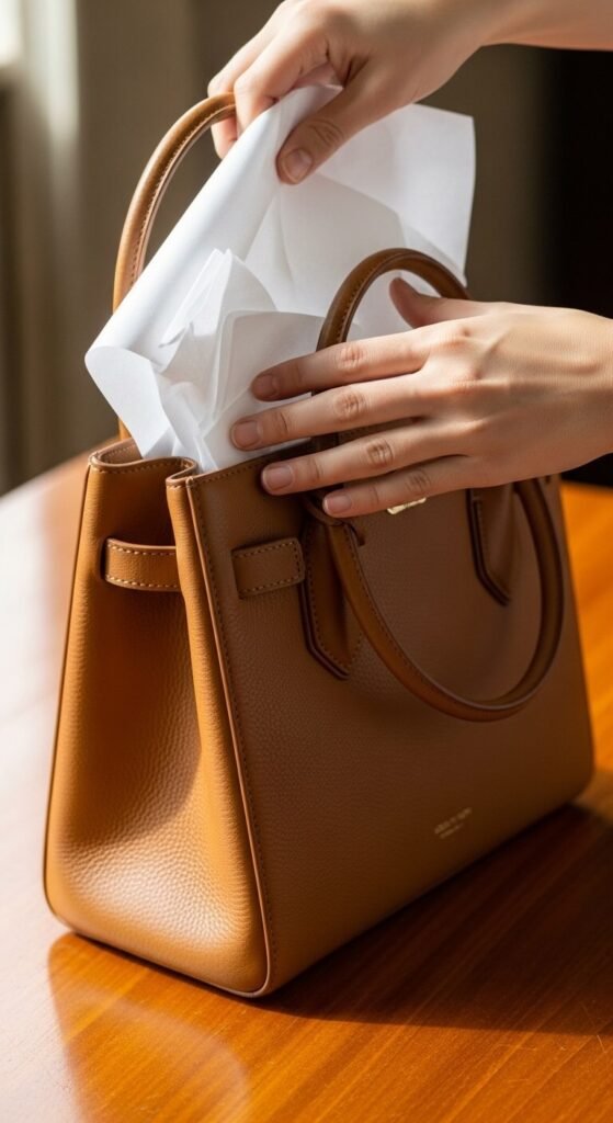 The goal is to fill the bag just enough so it holds its natural shape — not so much that it stretches the seams. For structured bags like box clutches or top-handle styles, this step is non-negotiable.