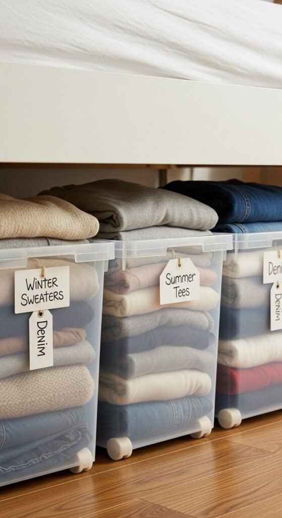 - Clear plastic bins with lids — airtight, stackable, and you can see what’s inside without opening everything