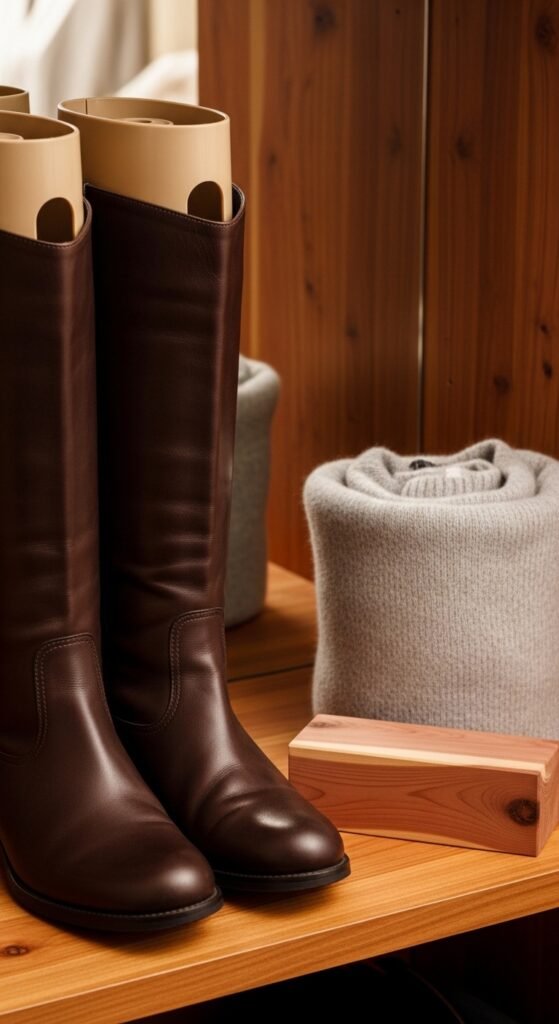- Stuff boots with boot shapers or rolled magazines to help them hold their form.